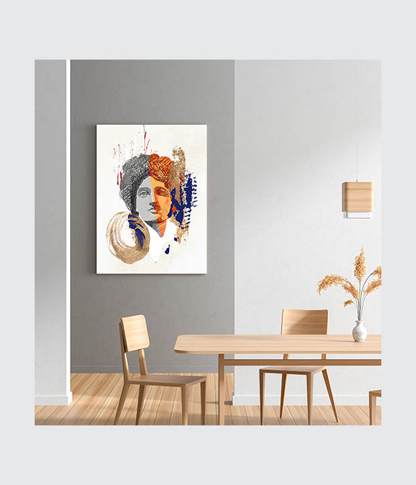 This artwork is a stunning blend of ancient Greco-Roman sculpture and modern abstract expressionism. 🎨 The contrast between the monochromatic grey and vibrant orange tones symbolizes the duality of the human spirit—calmness versus passion. 🏛️ Textured golden strokes and bold blue splashes breathe new life into a classical icon, bridging the gap between tradition and contemporary art. 🌀 It serves as a visual dialogue between the timeless past and the dynamic present. 🌟