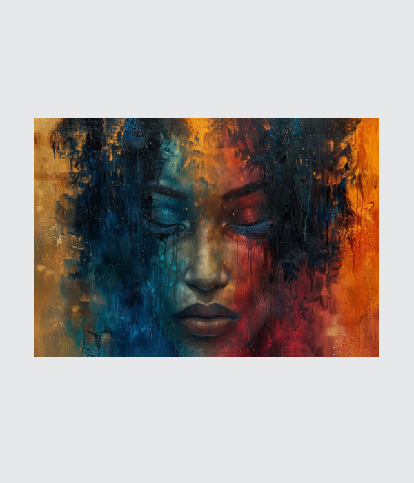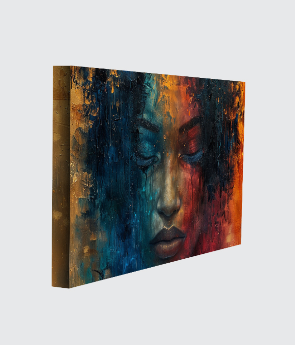This captivating canvas painting reflects emotion, depth, and inner reflection through a mesmerizing abstract portrait. The fusion of deep blues, fiery oranges, and rich textures creates a dramatic visual balance between calmness and intensity. ✨