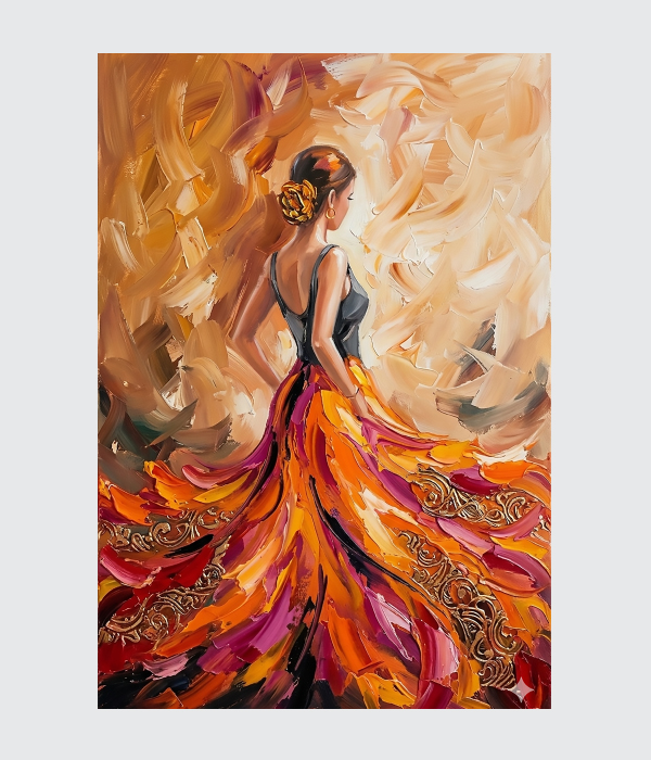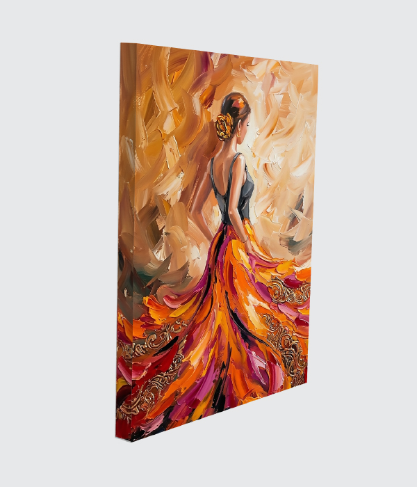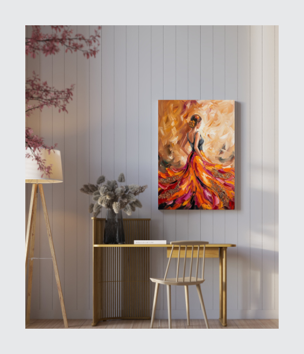 “Golden Grace” is an elegant canvas painting that celebrates beauty, sophistication, and feminine charm. The flowing dress in rich tones of gold, orange, and crimson creates a sense of movement and luxury, while the expressive brushstrokes add depth and modern artistic flair. 💃🎨
