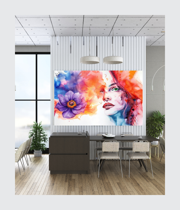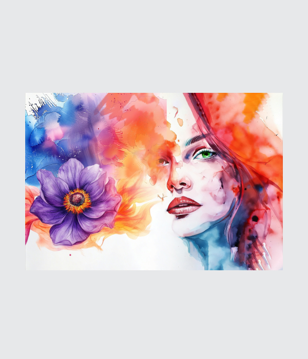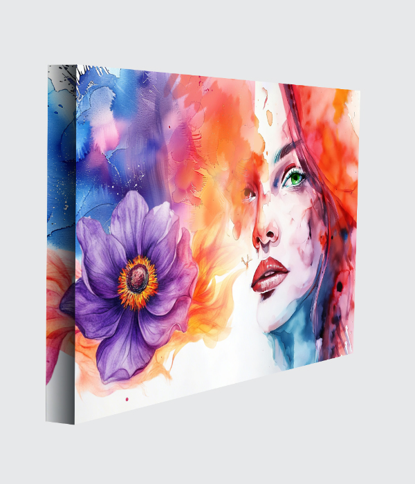This enchanting canvas painting blends feminine elegance, nature, and vibrant emotion into one captivating masterpiece. 🌸 The graceful portrait paired with the blooming flower symbolizes beauty, growth, and inner strength, while the flowing watercolour tones create a dreamy, artistic charm. ✨
