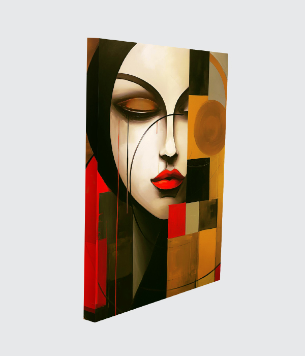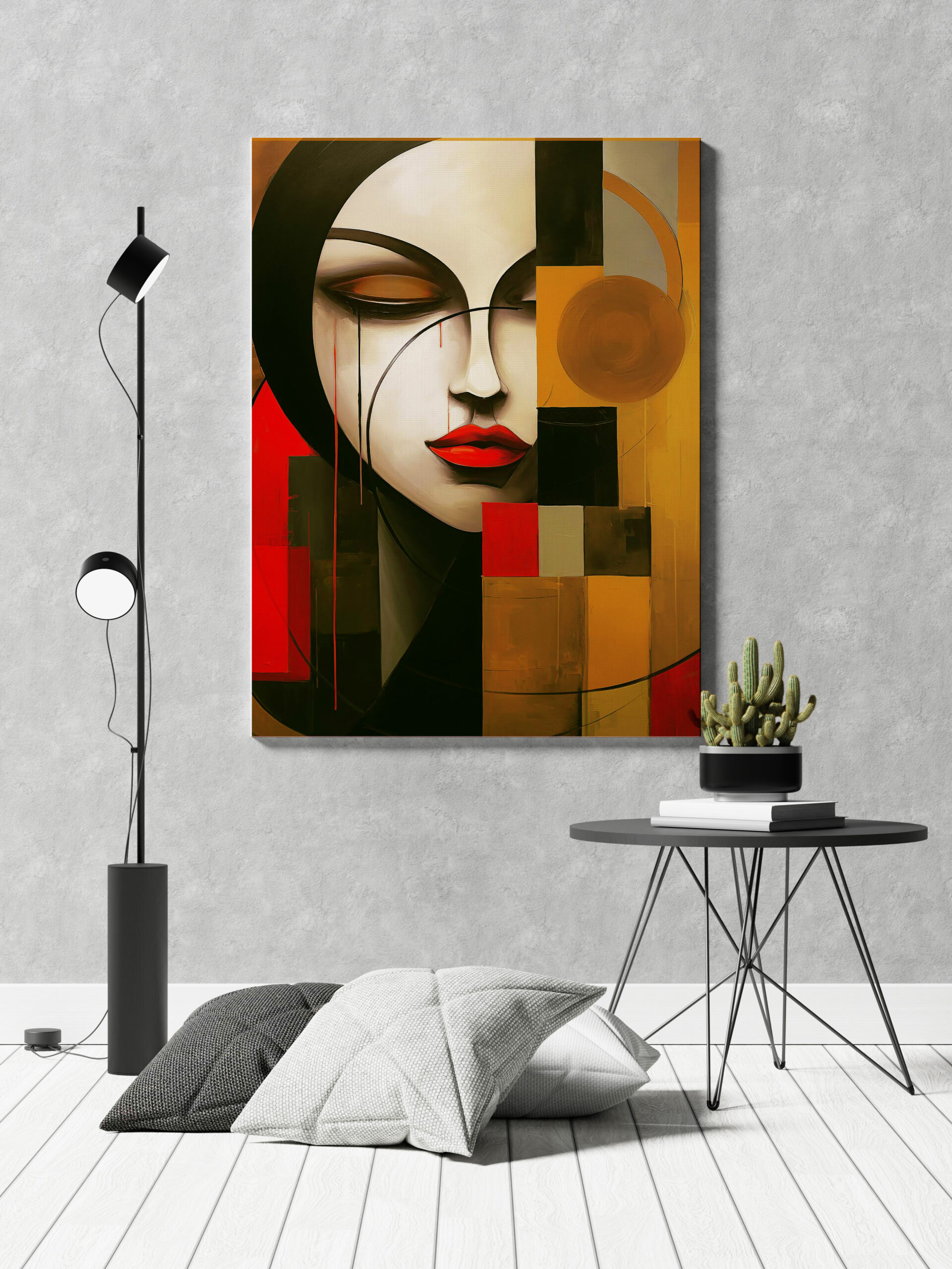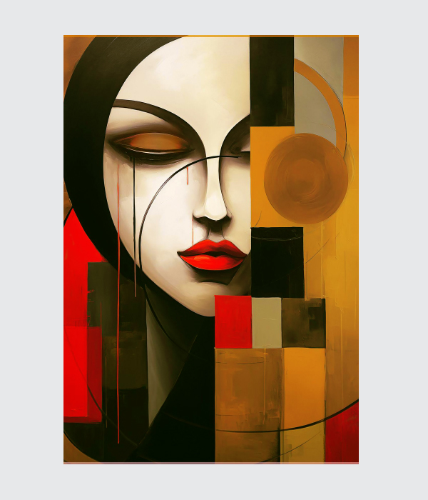 🎨 This captivating artwork blends elegance and abstraction, where a serene face emerges through bold geometric forms and rich colours. ❤️ The striking red lips and warm golden tones symbolize passion, mystery, and sophistication. ✨ Its modern composition creates depth and intrigue, making every glance reveal a new artistic detail. This painting is a beautiful fusion of emotion and design, perfect for those who admire contemporary art with a soulful touch.