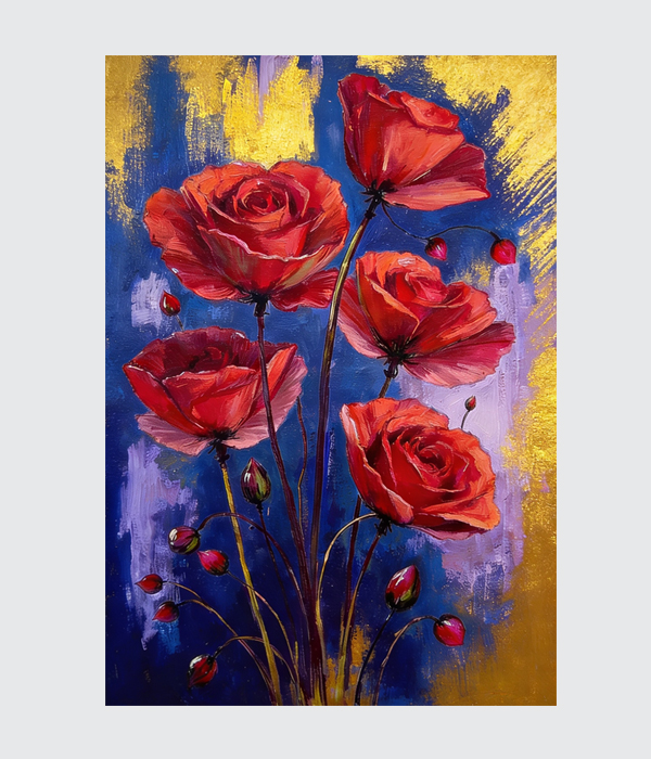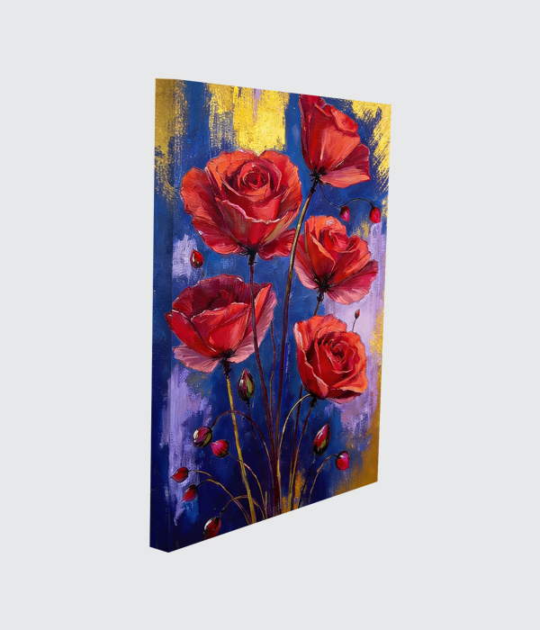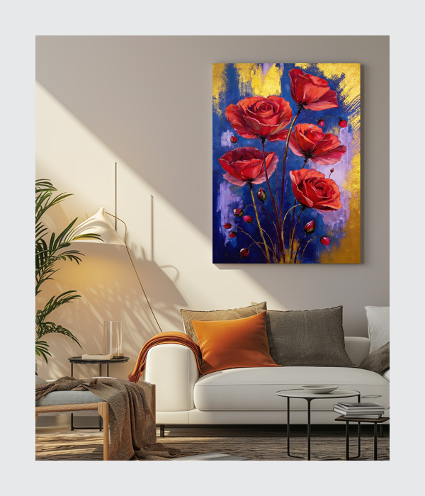 This stunning canvas painting radiates romance, vitality, and timeless beauty through bold crimson blooms rising against a dramatic blue and gold backdrop. 🌹✨ The rich contrast of colours creates a luxurious visual impact, while the expressive brushstrokes add movement and elegance. This artwork brings warmth, sophistication, and a vibrant floral charm to any interior.