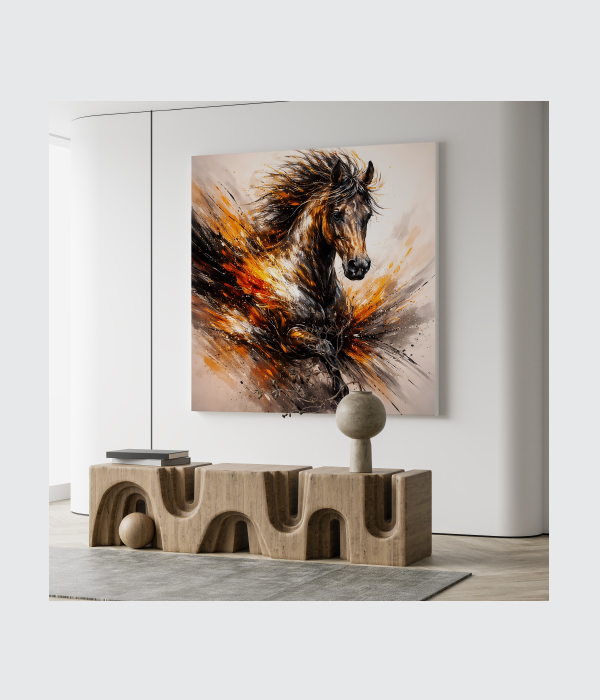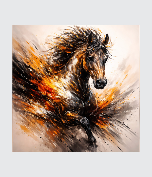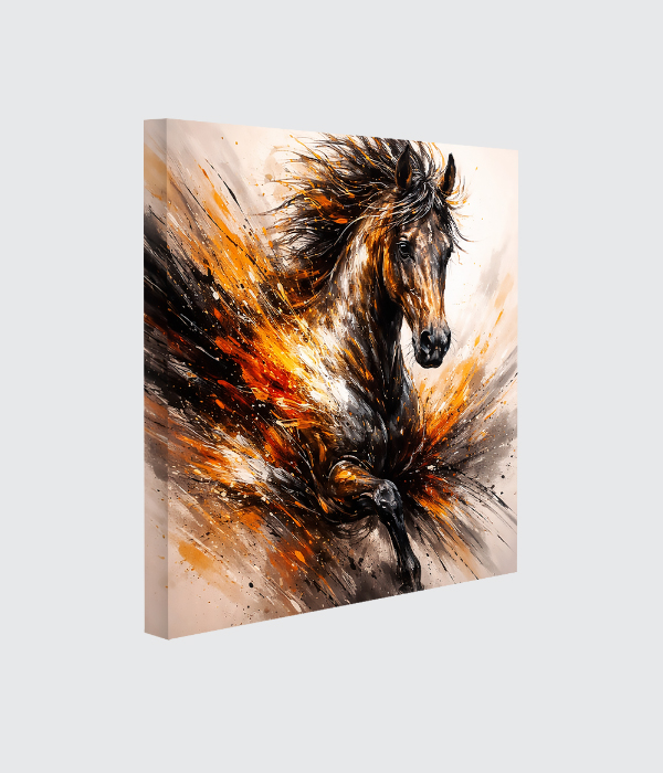 This stunning canvas painting captures the untamed power, speed, and freedom of a majestic horse in motion. With explosive strokes of black, gold, and fiery orange, the artwork creates a dramatic sense of energy and passion. The abstract splashes give it a modern artistic touch, while the powerful horse symbolizes strength, courage, and unstoppable spirit.