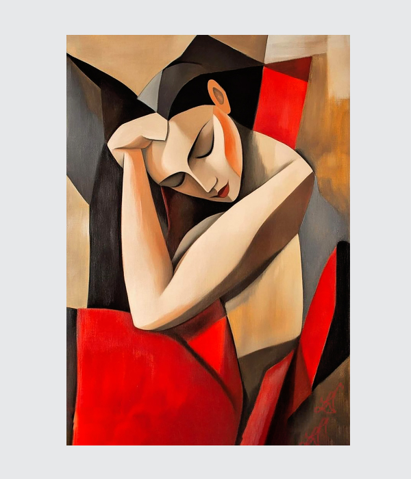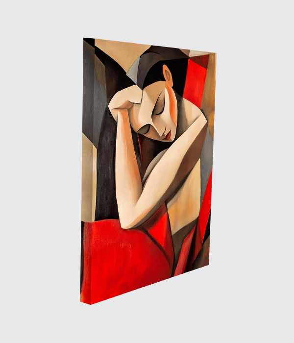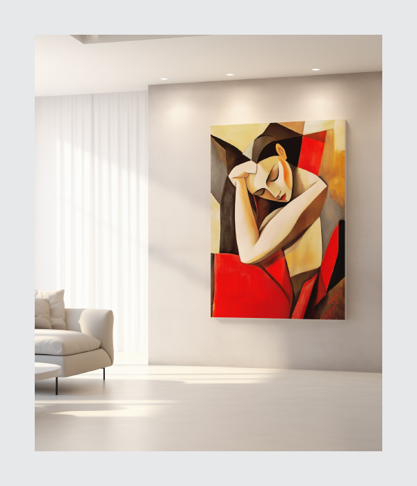 This beautiful canvas painting expresses peace, elegance, and introspection. The resting female figure, created with geometric forms and soft curves, reflects calmness and emotional depth. The blend of warm beige, black, and bold red tones gives it a luxurious and contemporary feel. ✨ It symbolizes rest, beauty, and the quiet strength of femininity.