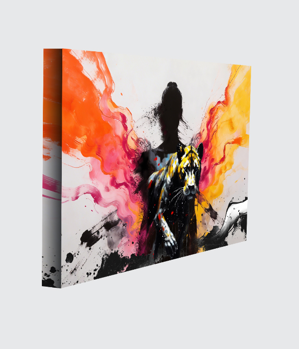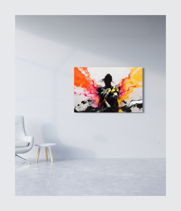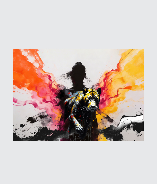 This striking canvas painting represents power, instinct, and inner energy through the bold presence of a panther emerging from vibrant abstract motion. 🐆 The fusion of flowing colors and shadowed human form creates a symbolic connection between wild strength and human spirit. ✨ Its dramatic composition makes it a powerful statement piece full of movement, mystery, and emotion.