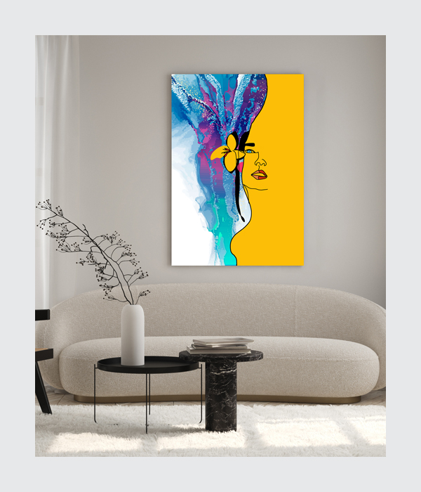 This striking piece features a minimalist line-art silhouette of a woman adorned with a vibrant yellow blossom.