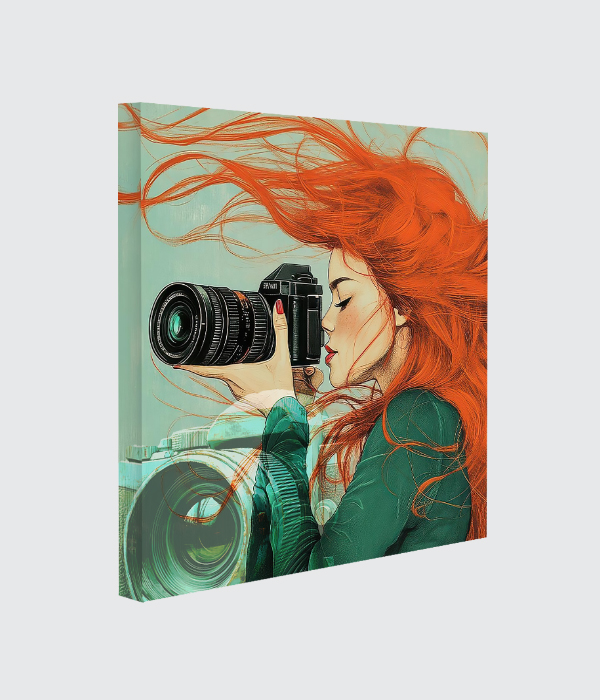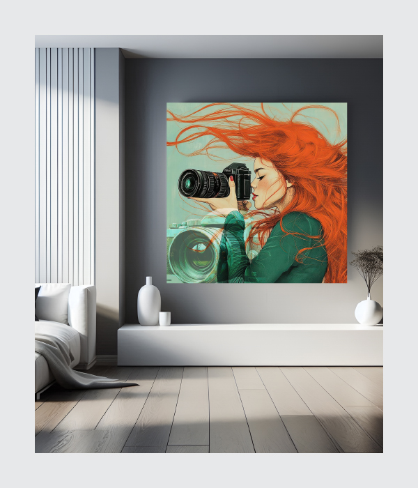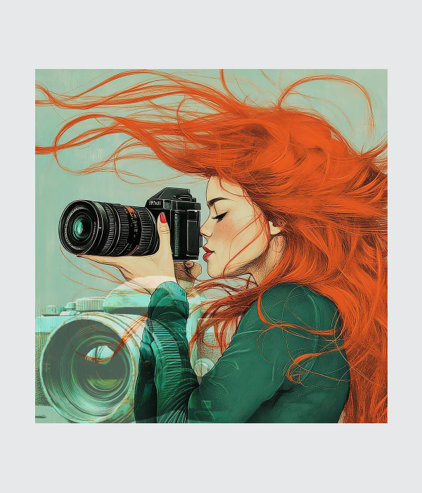 A passionate photographer captures the world through her lens, her fiery hair flowing freely like the wind of creativity. 🔥 The dynamic movement in her hair reflects energy, freedom, and an untamed artistic spirit. 🎨 Set against soft tones, the contrast highlights her focus and dedication to freezing perfect moments in time. ✨ This painting beautifully expresses vision, confidence, and the powerful blend of art and emotion behind every captured frame.
