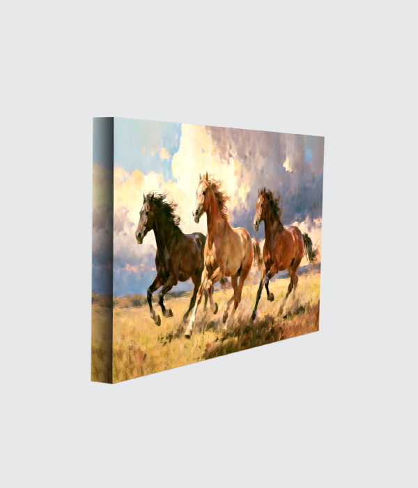 This dynamic painting captures the raw energy of three horses charging across an open field, utilizing sweeping brushstrokes and a dramatic, cloud-filled sky to evoke a sense of freedom and untamed power.