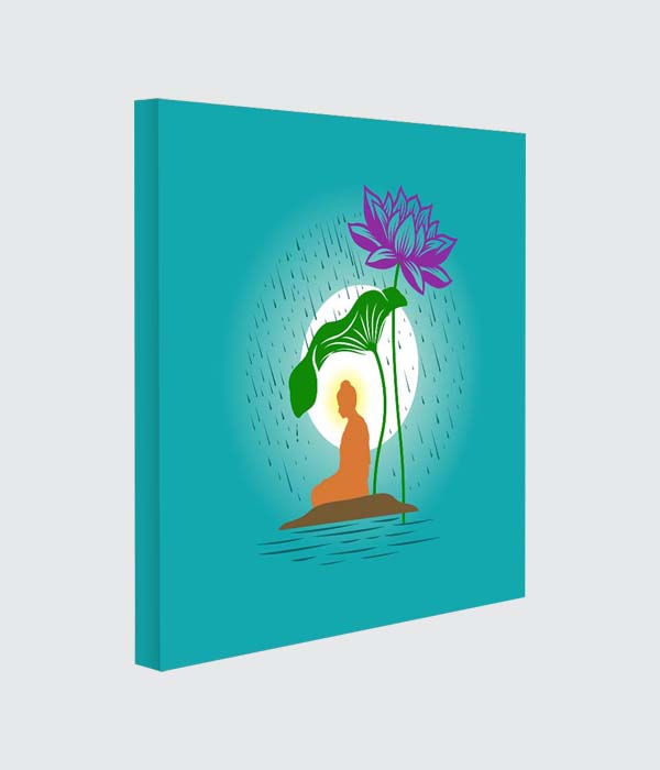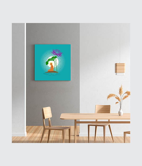This serene artwork depicts a silhouetted monk finding inner peace beneath a protective lotus leaf during a gentle rain.Its minimalist yet symbolic design serves as a beautiful reminder of stillness and resilience amidst the storms of life.An ideal focal point for a meditation room, yoga studio, or a peaceful bedroom sanctuary. ✨