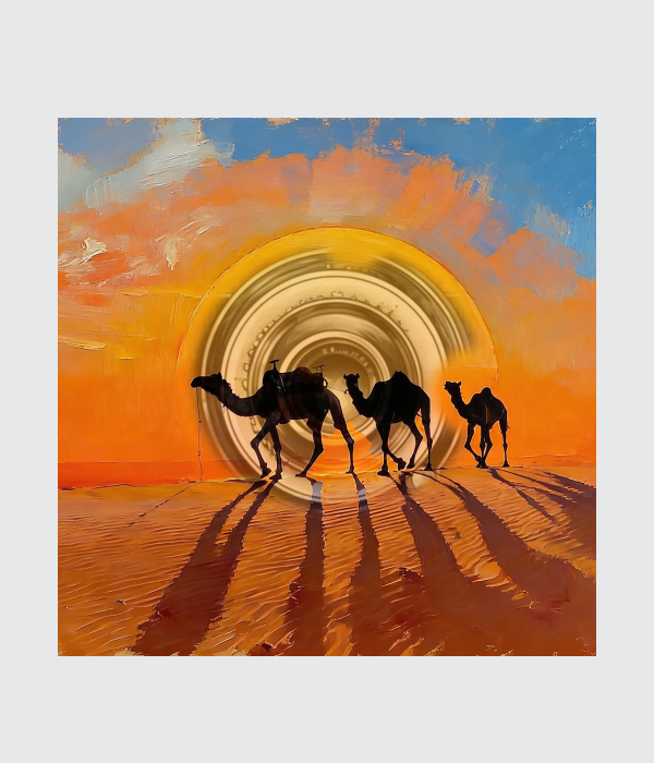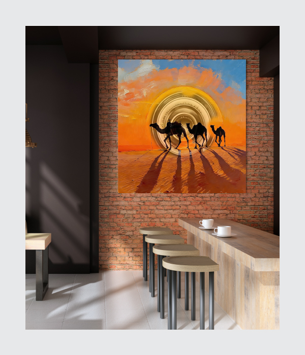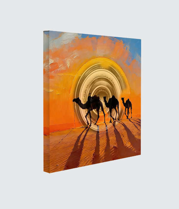 🐪 Under a radiant golden sun, a caravan of camels walks gracefully across the endless desert, casting long shadows on the warm sands. 🌅 The blend of fiery orange and soft blue sky creates a mesmerizing contrast, capturing both the heat and serenity of the moment. ✨ This painting reflects resilience, movement, and the timeless beauty of nature’s journey, inviting a sense of calm and wanderlust. 🌵 It feels like a silent story unfolding in the heart of the desert, where every step holds purpose and peace.