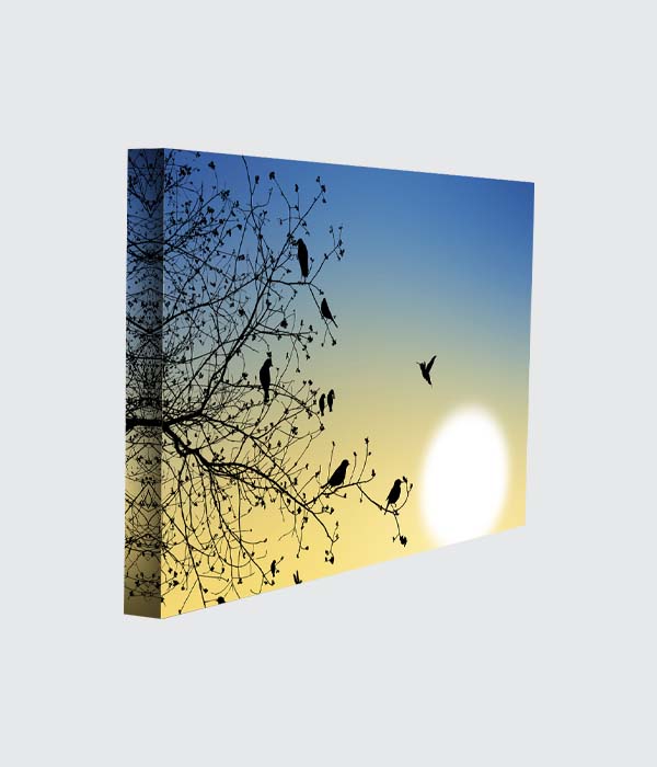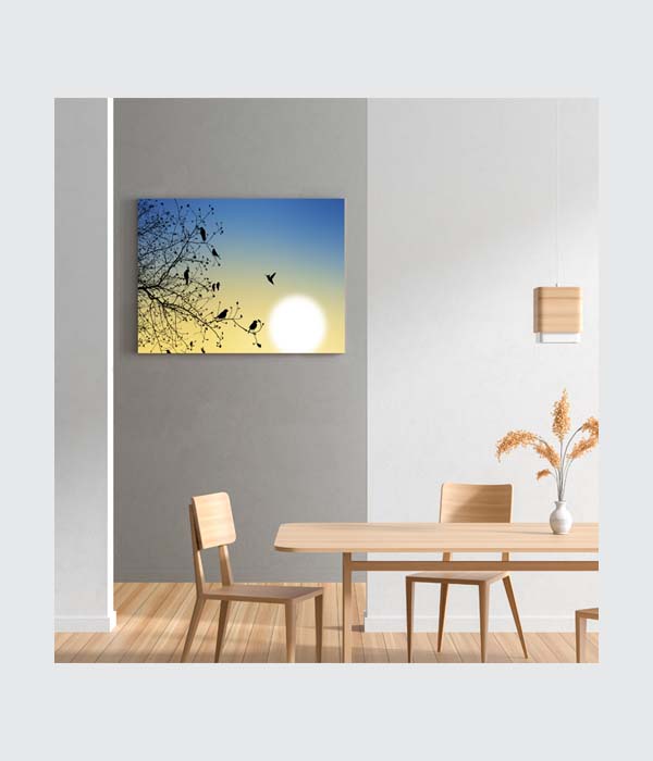 This peaceful canvas showcases delicate silhouettes of birds perched and in flight among sprawling branches. Set against a soft gradient sky transitioning from serene blue to a warm, sun-drenched gold, it captures the tranquil essence of a sunrise or sunset in the wild.☀️ Create a calming atmosphere in your sunroom, bedroom, or a quiet nursery.