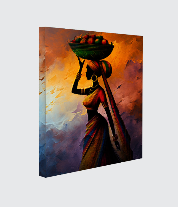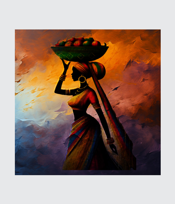 🌅 This stunning artwork captures the elegance of a woman walking with strength and balance, carrying a basket filled with abundance. Her silhouette against the rich, warm hues reflects resilience, tradition, and timeless beauty. 🎨 The blend of vibrant colors creates a sense of movement and cultural depth, telling a story of daily life with dignity and grace. ✨ This painting is a tribute to inner strength, harmony, and the beauty of simplicity.