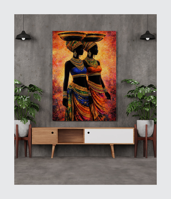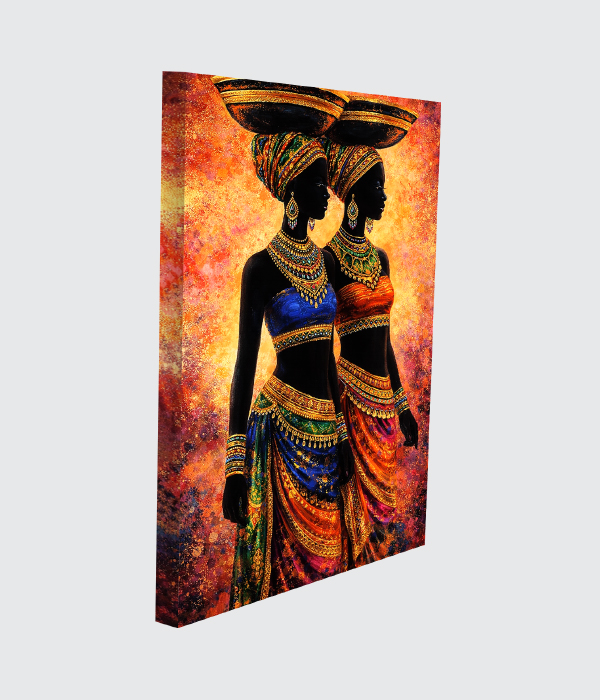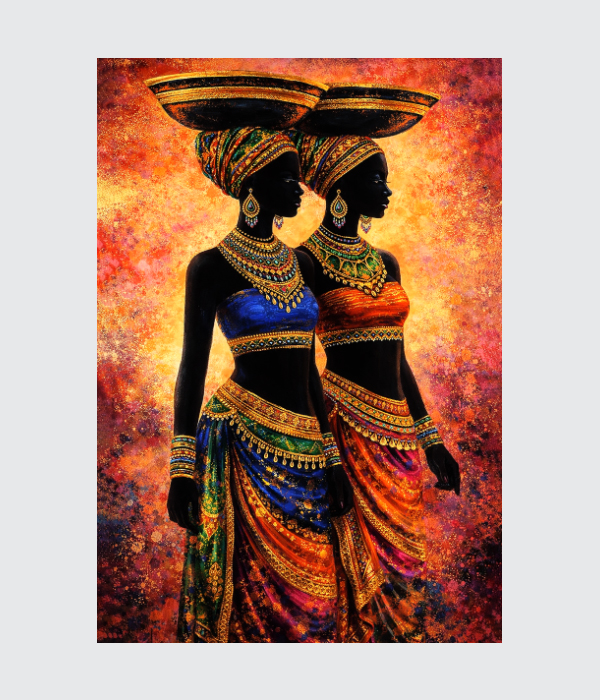 This stunning canvas painting celebrates culture, grace, and strength through two elegant women portrayed in vibrant traditional attire. Their balanced posture and rich ornamental details symbolize unity, dignity, and abundance. ✨ The glowing background and luxurious colors create a powerful visual presence, making the artwork both soulful and decorative.