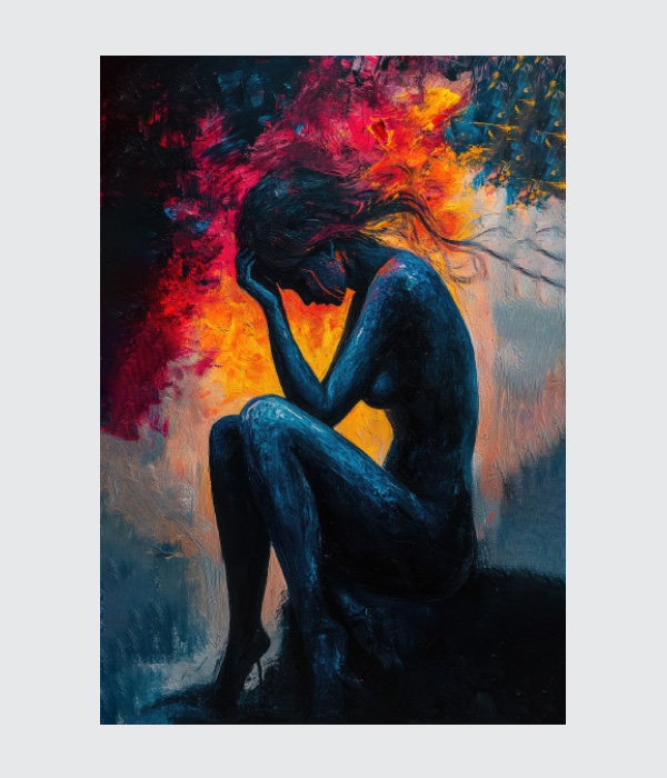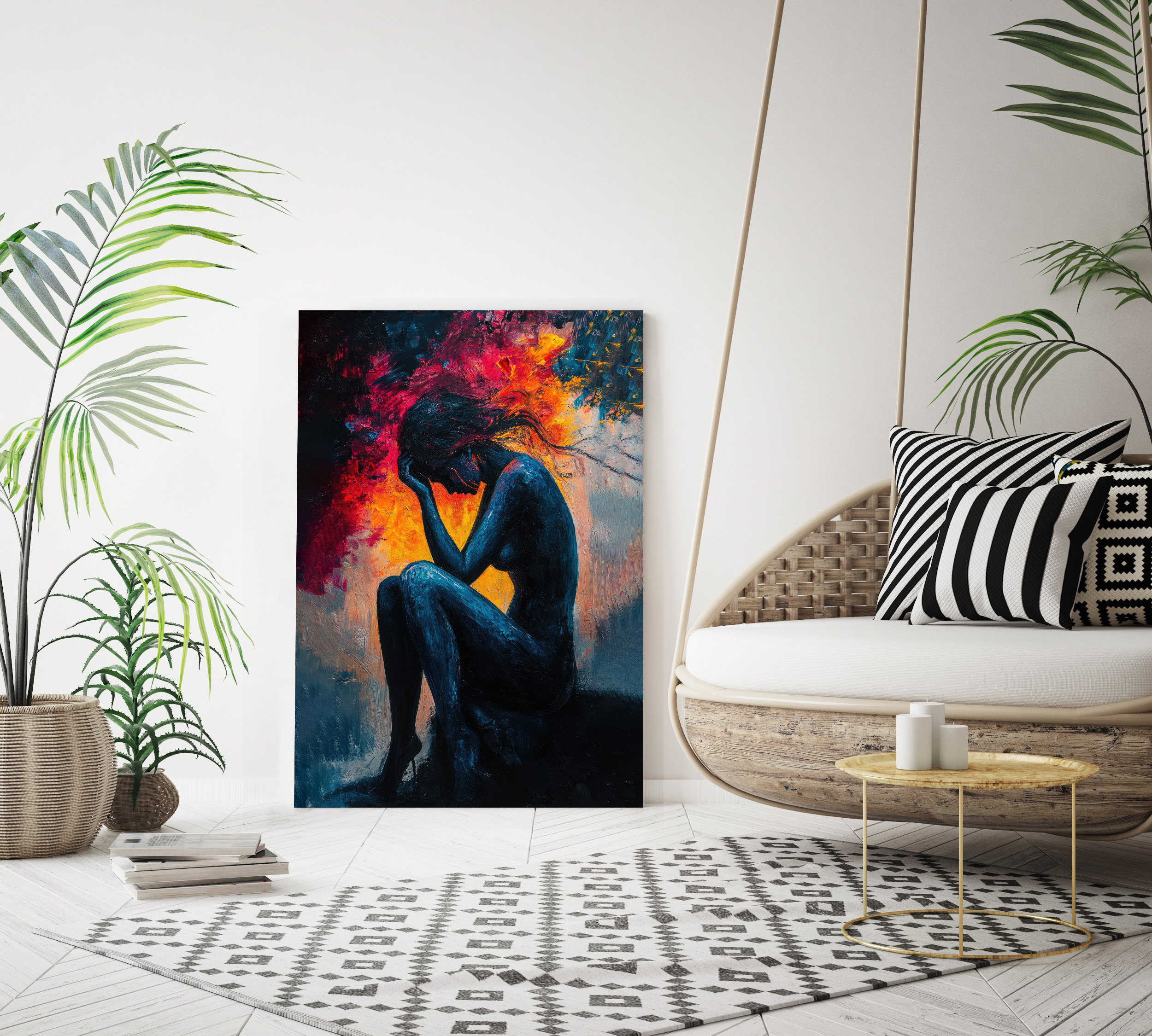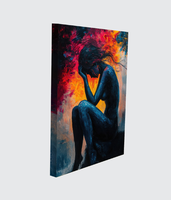 This evocative painting features a silhouetted figure in a contemplative pose, contrasted against an explosive backdrop of fiery oranges and deep magentas to represent the intensity of inner thoughts and human emotion.