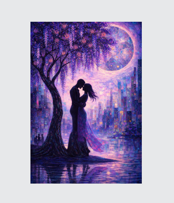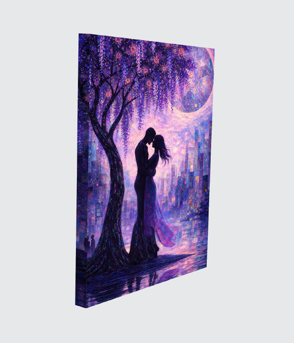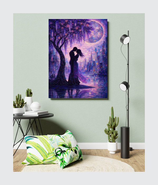 This enchanting canvas painting captures a magical moment of love, intimacy, and dreamlike beauty. A couple stands embraced beneath a glowing moon, surrounded by shimmering purple tones, reflections, and a mystical cityscape. 🌙 The artwork creates a poetic atmosphere where romance meets fantasy, making it deeply emotional and visually mesmerizing.