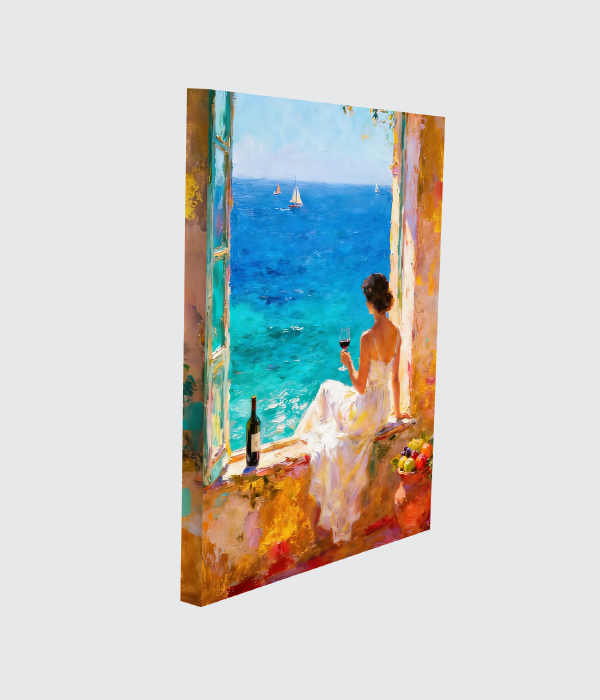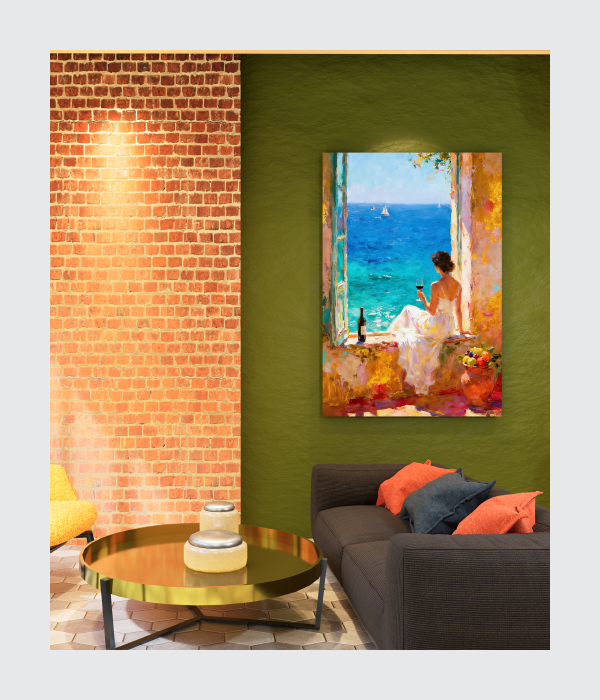 🌊 A serene woman sits by an open window, gazing at the endless blue sea while gently holding a glass of wine. 🍷 The soft breeze, the distant sailboats, and the vibrant colors create a dreamy escape filled with peace and elegance. 🎨 The blend of warm interior tones and cool ocean hues reflects a perfect harmony between comfort and freedom. ✨ This painting captures a quiet moment of relaxation, inviting you to pause, breathe, and enjoy life’s simple luxuries.