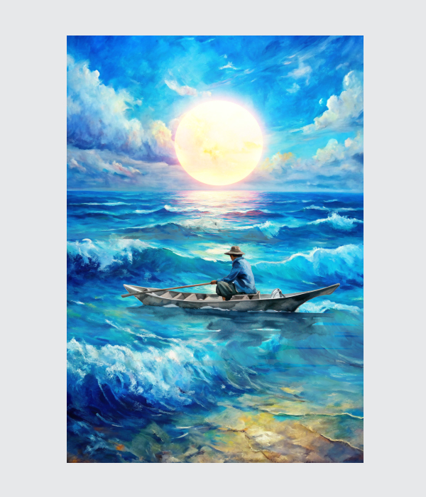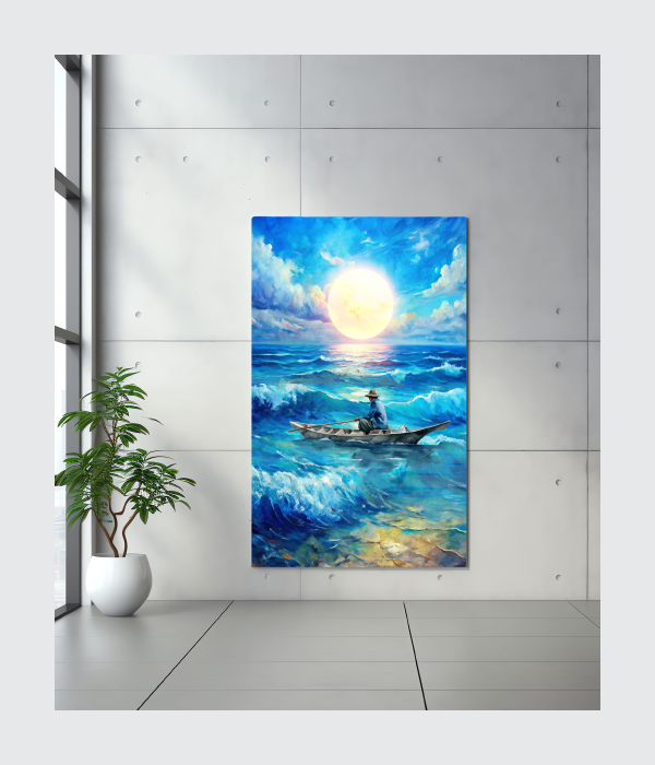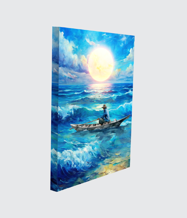 This vibrant canvas painting features a solitary figure in a wooden boat, navigating through rolling, multi-toned blue ocean waves.A large, brilliant yellow and white sun dominates the sky, casting a glowing reflection across the water towards the horizon.