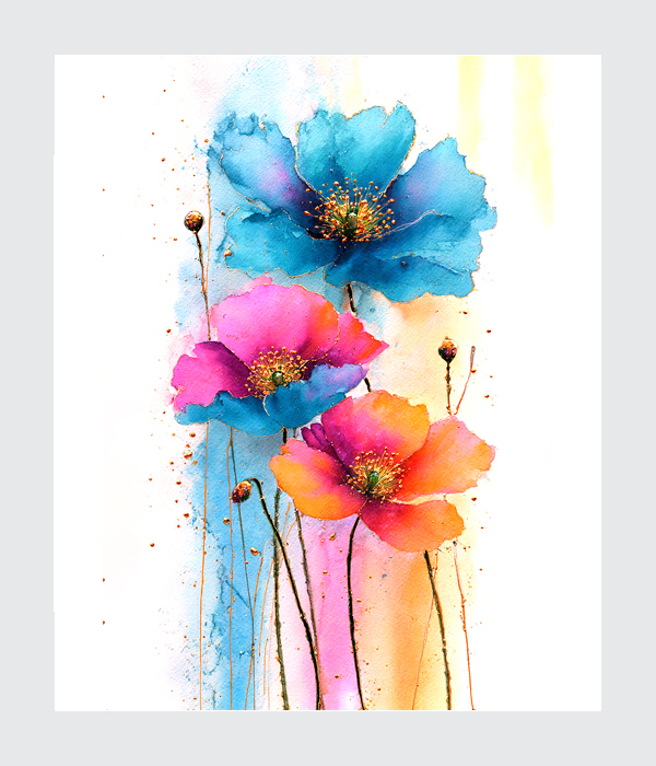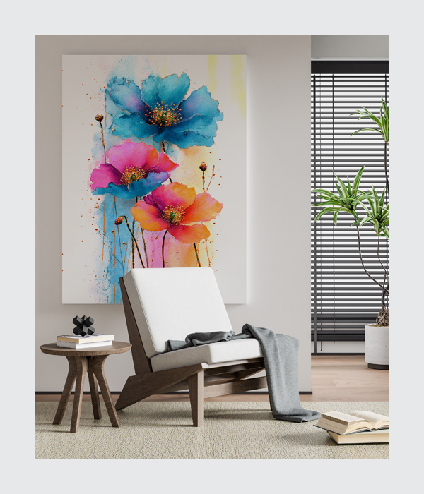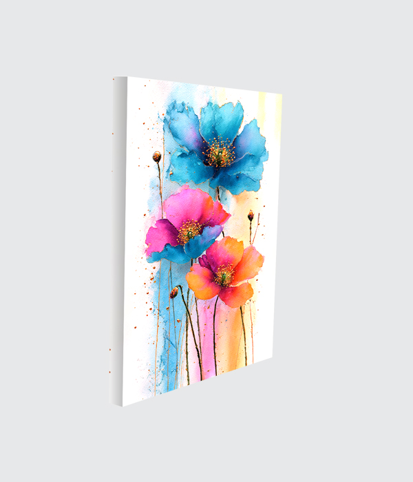 This delicate and vibrant canvas painting celebrates nature’s beauty, softness, and joy through graceful blooming flowers in radiant blue, pink, and golden hues. 🌸 The watercolour flow gives the artwork an airy, elegant feel, while the lively colours bring freshness and positivity to any space. ✨