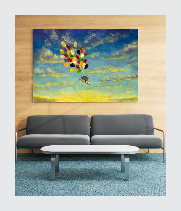 ✨ A whimsical painting of colorful balloons lifting a small house into the sky. 🎨 Vibrant hues against a dreamy sky create a joyful and imaginative vibe. 🌈 Perfect artwork to spark creativity and add positivity to your space. 💫 A beautiful blend of fantasy and art that brings lightness and charm. 📍 Ideal for living rooms, kids’ rooms, creative studios, or bedrooms to create a cheerful and dreamy atmosphere 🏡🎨