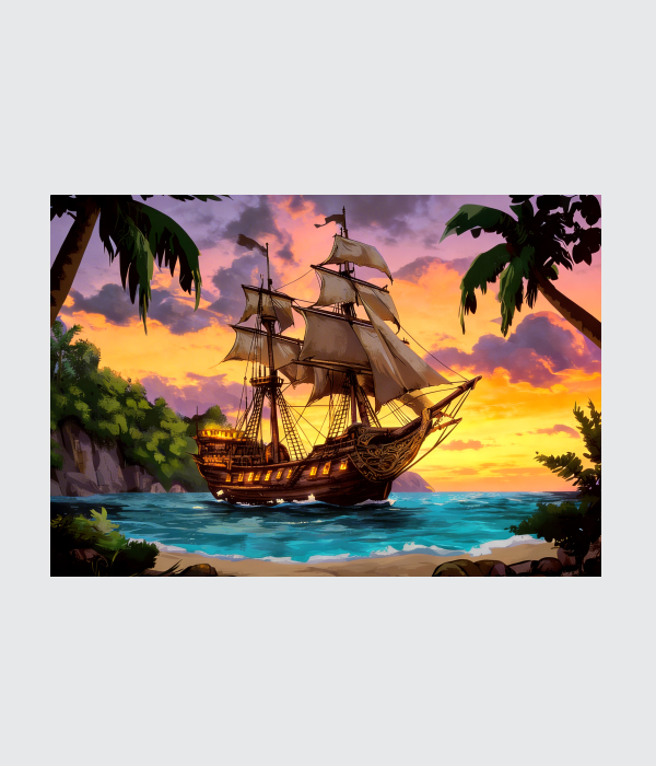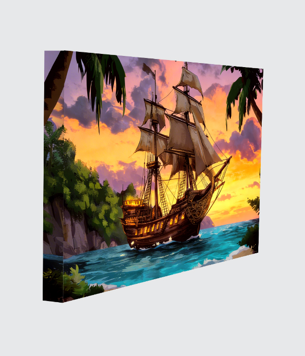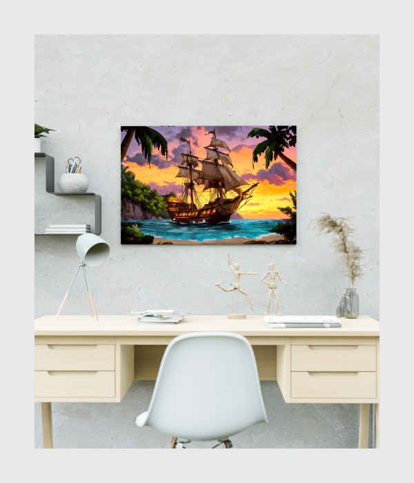 This captivating canvas painting features a detailed, gilded tall ship sailing through turquoise ocean waves. 🚢🌊Set against a breathtaking sunset, the sky transitions from deep purple and orange to a warm golden glow. 🌅☁️A lush tropical island with cliff formations and palm trees frames the scenic view from a tranquil beach. 🌴Intricate wood details on the ship’s hull and sails evoke the raw spirit of adventure and discovery.