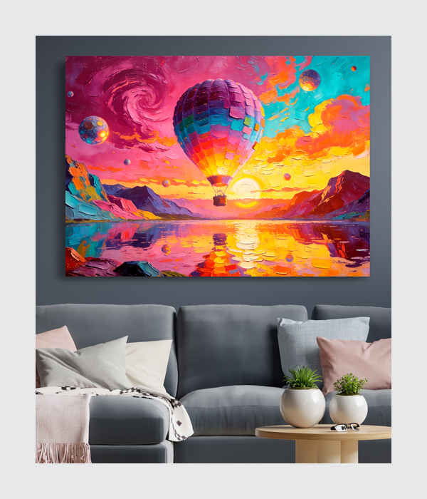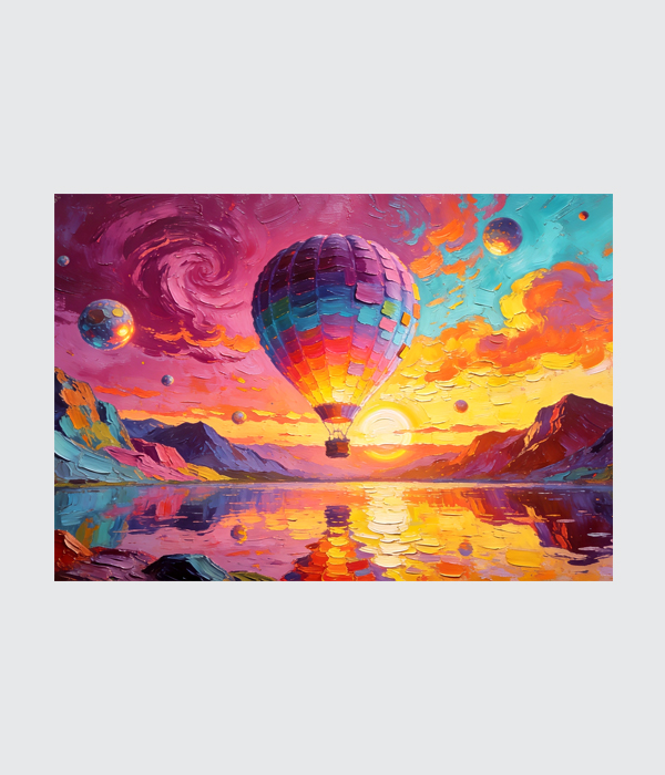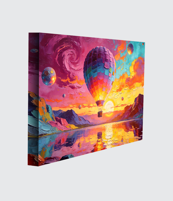 “Dream Voyage” is a breathtaking canvas painting filled with imagination, freedom, and adventure. The vibrant hot air balloon floating over a glowing sunset lake creates a magical fantasy world, while the rich colors of pink, purple, blue, and gold bring life and energy to the artwork