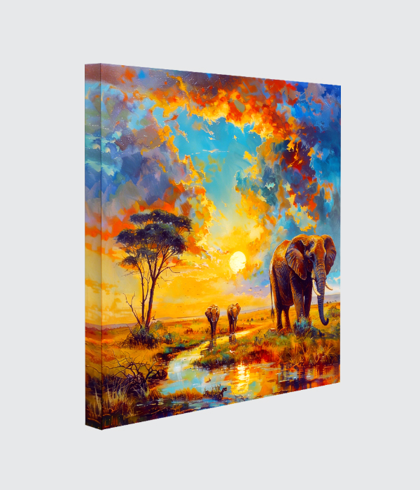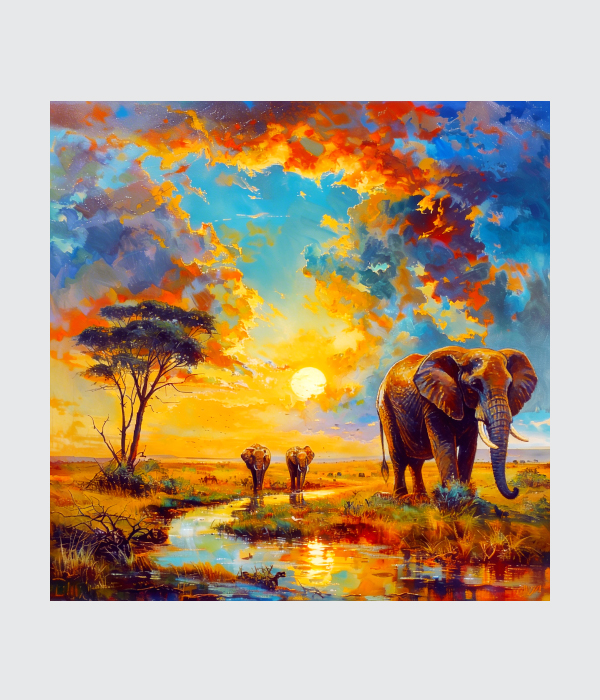 A vibrant and textured canvas painting capturing a stunning sunset over the African savannah landscape. 🌅🐘 Features a detailed large elephant with prominent tusks and a smaller pair of elephants near a reflecting pool of water. 👨👩👦 A solitary, flat-topped acacia tree is beautifully silhouetted against the glowing sky on the left. 🌳✨ The sky is a dramatic masterpiece of swirling clouds rendered in bold reds, oranges, yellows, and deep teals. ☁️🎨 Bold brushstrokes and rich impasto texture bring the energy of the wild and the warmth of the sun to life.