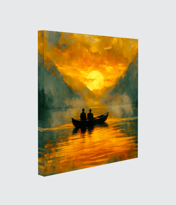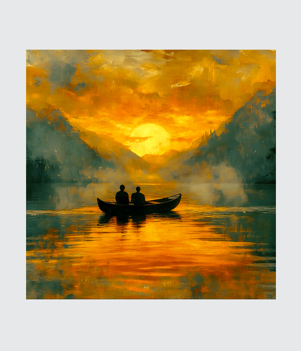 Two souls drift gently across a golden lake beneath a glowing sunset 🌄💛 The warm amber sky reflects beautifully on the calm waters, creating a dreamlike glow 🌊✨ Surrounded by quiet mountains, the scene captures peace, connection, and stillness 🌿 The silhouettes in the boat symbolize companionship and shared journeys ❤️🚣