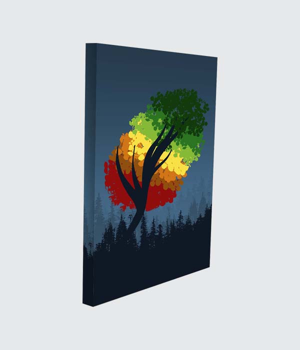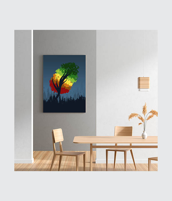 This striking piece features a silhouetted tree bursting with a vibrant, rainbow-colored canopy against a moody, deep-blue forest backdrop. It beautifully contrasts the mystery of a dark woodland with a joyful explosion of primary and secondary colors, creating a bold focal point for any room.🌈 Add a pop of creative energy to your living room, modern hallway, or a child’s playroom. 🌳
