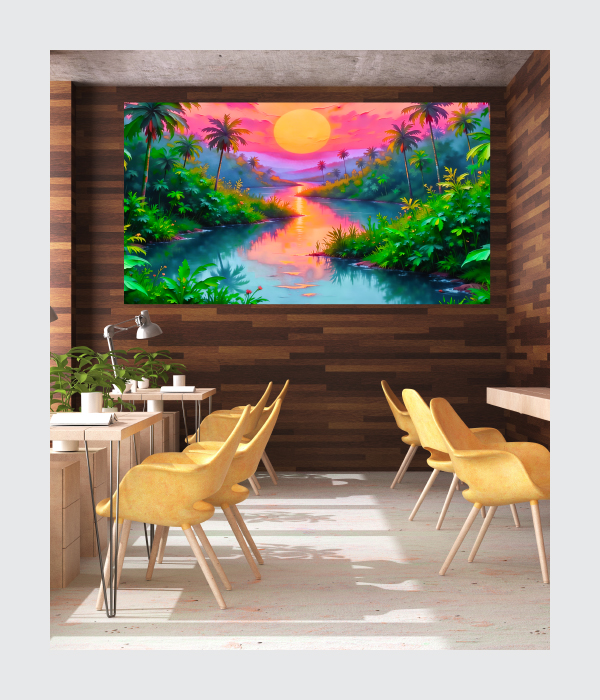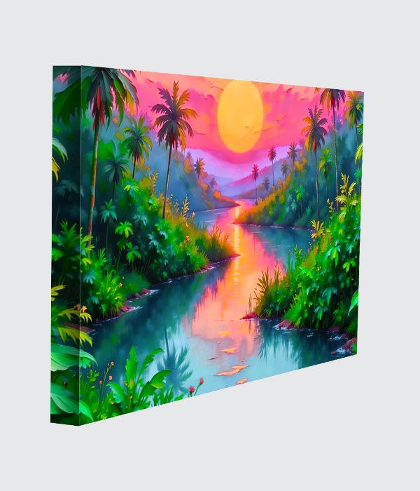 A breathtaking canvas of a winding river in a dense, green jungle, bathed in a vibrant neon-hued sunset! 🌴☀️🌅Lush palms and exotic plants frame the water, reflecting the beautiful pink and orange sky. 💖A large, warm sun glows brightly, creating a shimmering reflection on the river. ✨🌅The color palette is so magical, mixing natural greens with fantastical pinks and purples. 💖💚