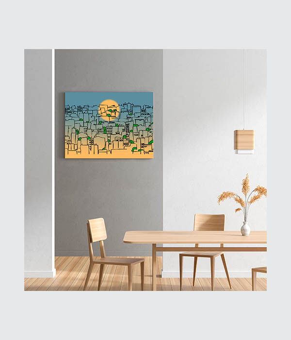 This playful yet sophisticated canvas features a hand-drawn sprawling cityscape under a warm, glowing sun. Combining whimsical line work with a soft gradient of sunset oranges and cool slate blues, it captures the charming complexity of city life in a unique, modern-art style. A perfect conversation starter for a creative workspace, urban apartment living room, or a trendy studio. 🎨